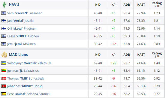 图二为MAD Lions的选图Ancient,先作为防守方的HAVU在xseveN的带领下展现了出色的防守状态,半场战罢HAVU带着三分的领先优势进入到下半场。下半场MAD Lions状态回暖,多次抵挡住HAVU的进攻,但HAVU及时调整回了自己的进攻节奏并保持到了最后,最终HAVU有惊无险的赢下比赛胜利。