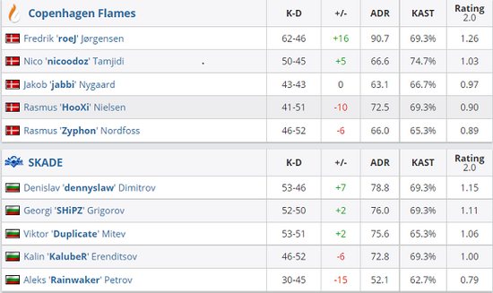 图一CPHFlames在roej的带领下顺利的赢下自己的选图,可在图二Inferno中惨遭SKADE的暴打,全场CPHFlames仅拿到五分。决胜图CPHFlames在半场比分处于落后的情况下,在下半场开始疯狂追分,乱了节奏的SKADE大势已去,CPHFlames成功逆转。