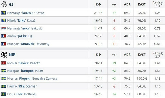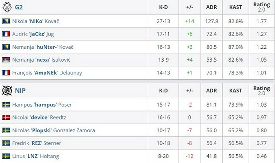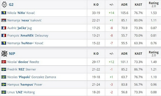 NIP在决胜图炼狱小镇上以进攻方开局,输掉手枪局的他们立刻做出反应完成强起翻盘,并在之后的对局中进一步将分差拉开,G2仅依靠NiKo个人能力发挥拿到宝贵的几分。来到下半场后丢掉手枪局的G2已经没有过多的容错,最终赢下关键局的NIP以16-9结束比赛。
