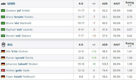 图一的失利并未影响MIBR的状态,他们在核子危机上与BIG打的有来有回,exit与shz在防守端一同取得破百的adr,带领队伍于上半场以一分的微弱优势领先。但当德国战队再次来到防守端后,比赛同样再次陷入一边倒的局势,他们仅让巴西战队拿到一分就将比赛结束,最终比分定格在16-9。