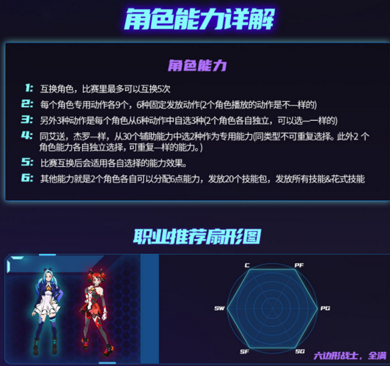 角色可以从30种辅助能力中选2种作为专用能力(篮板距离增加和篮板高度增加不能同时选择,2个角色是各自独立选择)比赛过程中选择的辅助能力全程生效。