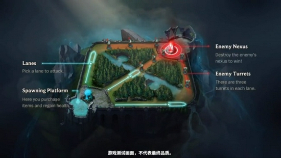 游戏画风与端游几乎一致。峡谷地图被等比例缩放到手机上适应的大小,取消了门牙塔和兵营。同时局内地图使用了镜像设计,玩家永远会处于左下角的蓝色方。游戏继承了战争迷雾,当英雄站在特点位置几秒钟会自动插眼,眼的数量会随着时间进行回复。
