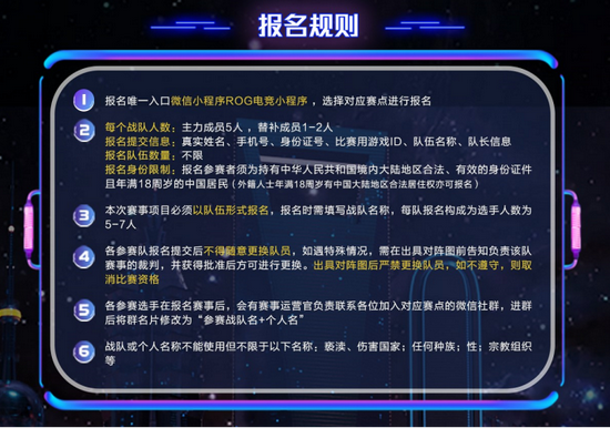 现在,2021星途电竞联赛报名系统已经正式开启,报名唯一入口微信小程序ROG电竞小程序。只要玩家满足18周岁,便可以以队伍的形式选择对应的赛点进行报名(每个战队人数为5~7人,5位主力队员,1~2位替补队员)。然后通过相应的海选赛和选拔赛等等,向上晋级,成绩越好,被星途联赛以及其他电竞俱乐部所认可的机会就越大,玩家的电竞梦也会越来越近。