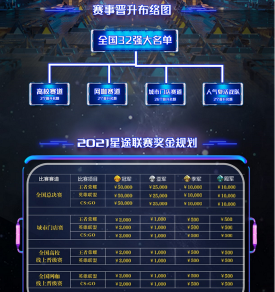 本届星途电竞联赛全国32强晋级大名单中,高校赛道和网咖赛道,各自拥有2个晋级名额,城市门店赛道则拥有26个晋级名额。(另外2个晋级名额为“人气复活战队”)而2021星途电竞联赛的总奖金也高达75W+,全国总决赛冠军战队将直接获得5W元奖励(具体可参考下图)。