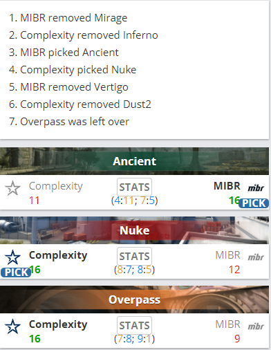 Complexity 2-1 MIBR(Ancient 11-16;Nuke 16-12;Overpass 16-9)