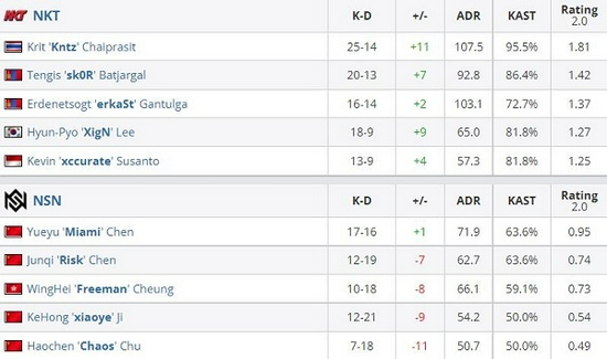 来到自己的选图后NKT显得更加得心应手,先以进攻方开局的他们在Kntz的完美发挥之下再次将NSN完全压制,NSN仅依靠着Risk与Miami的发挥从对手空中抢回几分。进入下半场后NSN成功赢下手枪局,但NKT在后续的长枪局中卷土重来,以一波干净利落的五连胜一举将比赛终结,最终比分16-6。