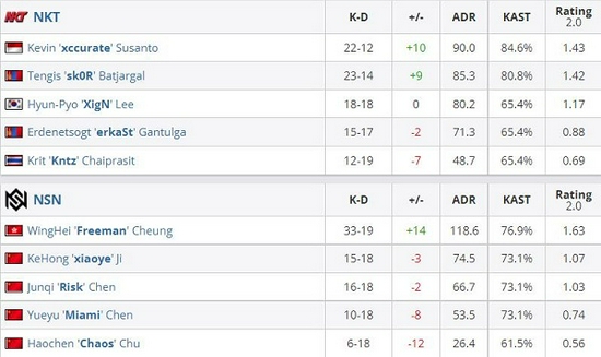NKT在对手的选图荒漠迷城上依旧展现出强大的统治力,xccurate在防守端砍下15-6kd与105adr,sk0R与XigN则以90+的adr紧随其后,上半场结束时NKT以10-5领先。攻防互换后NSN的Freeman火力全开,几乎是仅凭一己之力带领队伍连续追分,但这终究不是一个人的游戏,NKT的整体状态明显更胜一筹,最终以16-10赢下图一。