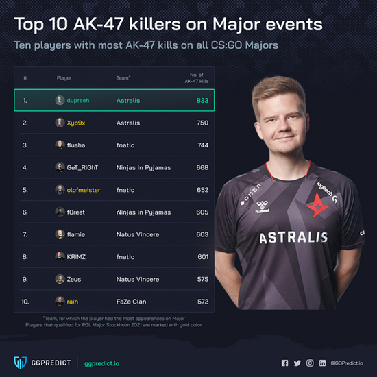 十大AK使用者的名录中,2位A队选手——dupreeh和Xyp9x排名前二,他们的AK击杀数最多。