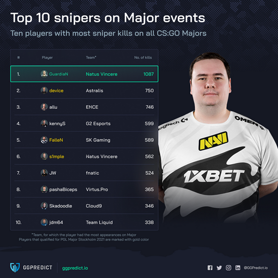 实际上,瓜皇才是目前Major历史上大狙击杀数最多的狙击手,他以1087个击杀遥遥领先device。