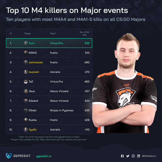 十大M4使用者的名单中,前VP选手Byali最能发挥警专的威力。