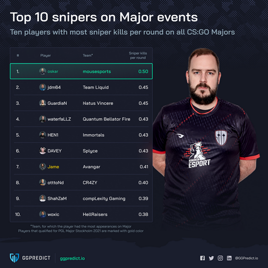 而每小局大狙击杀的评比中,前Mouz选手、现Sinners老将oskar拥有最高的大狙击杀效率。