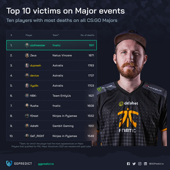 今日,国外数据分析网站ggpredict公布了数个关于历届Major的数据统计。(统计图所列的队伍是该选手亮相Major时的主要队伍,出席PGL斯德哥尔摩Major的选手的名字将标金)