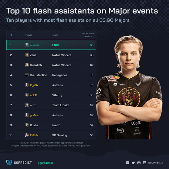 前ENCE的Aleksib最善于在Major上白人,他的闪光弹助攻数是目前最高的,不过该记录也许很快会被9爷或gla1ve打破。