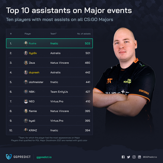 Major历史有效支援数前十的统计中,前fnatic的flusha冠绝榜单,9爷和Zeus紧随其后。(奥拉夫未标金)