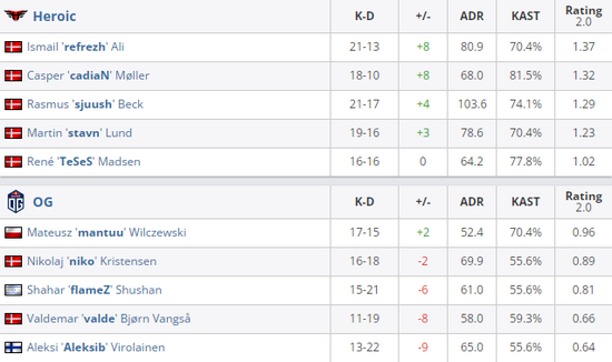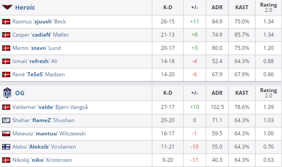 图二来到了Heroic自己的选图,OG先做CT。拿下手枪局的OG拿到5-0的领先,但是随后比赛又进入了丹麦人的节奏。耐心的控图和细节拉满的一波进攻帮助Heroic反超比分,半场两队依旧是8-7。来到下半场,拿下手枪局的Heroic稳住优势,B区的refrezh发挥出色,多次打出连杀帮助Heroic止住对面的攻势。最后的关键局中也是他大胆的前摸发现雷包拖住对手,让Heroic成功16-11终结比赛,晋级BLAST Premier秋决。