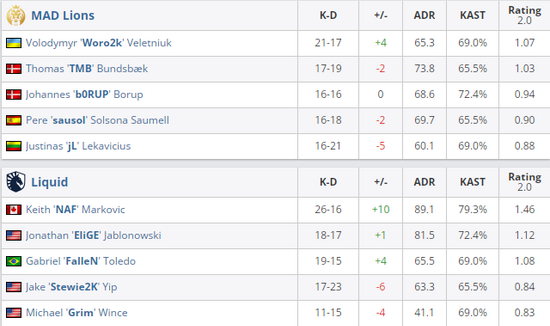来到自己的选图,Liquid先做进攻。这一次他们没能在开局取得优势,相反MAD Lions用出色的顶中路近点阻挡了Liquid的进攻,几波打B也进展不顺,半场Liquid 5-10落后。来到下半场,赢下手枪局的Liquid突然起了节奏,教父的狙击枪也开始发挥,一举反超比分的Liquid成功抵挡住了MAD Lions的攻势。NAF今天的状态也是无人可当,拿连杀、赢残局,他做到了他能做到的所有事。图二砍下26个人头的他带领队伍逆风翻盘16-13拿下对手。