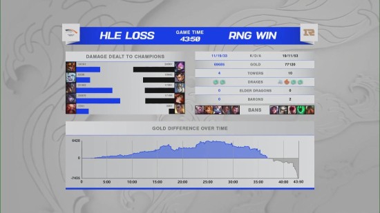 前期双方相互僵持,无爆发人头;14分半钟上路1换1,随后先锋团中RNG被击杀两人;17分钟RNG拿下第二条小龙并击杀对方上单,随后面对对方的三人追击,RNG反打击杀对方两人;30分钟对方主动开打大龙,RNG直接进场打团,最终打出2换3;34分钟RNG主动抓住机会开团击杀对方两人,顺势拿下听牌龙;35分钟通过拉扯打团,RNG击杀对方三人,并拿下第一条大龙,经济追回;39分钟RNG拿下水龙魂;42分钟RNG拿下第二条大龙,利用大龙buff一波推进拿下比赛。本场比赛MVP给到Ming芮尔。
