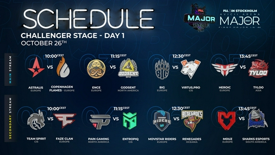 10月26日开始的PGL斯德哥尔摩Major挑战者组第一轮对阵已经正式公布。揭幕战便是丹麦德比Astralis对阵Copenhagen Flames,TYLOO首轮也将挑战丹麦队伍——Heroic。
