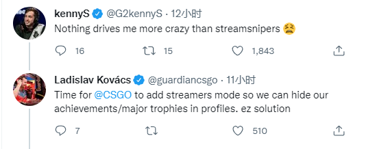 kennyS最近发推抱怨直播被窥屏者打爆的事情,很快瓜皇也在下面回复自己的看法,两个曾经的“狙神”一波梦幻联动引得CSGO官方也来凑了一波。