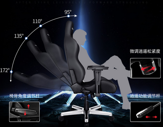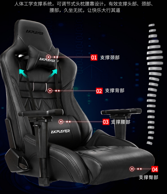 一把好的座椅对身体舒适度具有极高的重要性,选择一张适合自己的椅子,是一个非常值得关注的事情.刚才我们提到了电竞椅和普通座椅的区别,电竞椅往往采用人体工学设计,更能带来舒适坐感,比如颈椎、腰椎是人体易损的脆弱部位,电竞椅通过对这几个部位的包裹、支撑,可以很大程度上分解腰、颈的受力. 另外考虑到个体差异,设计师还在座椅上增配了头枕、腰部靠枕,以满足不同消费者对产品的细节需求.