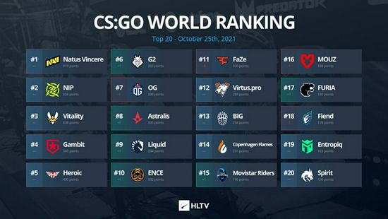 大赛当即,HLTV在今日公布了Major前最后一次世界排名更新。
