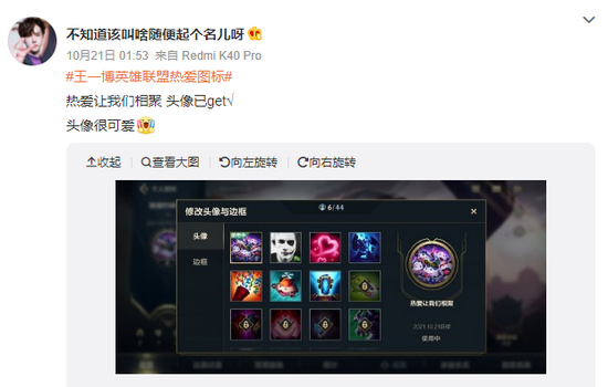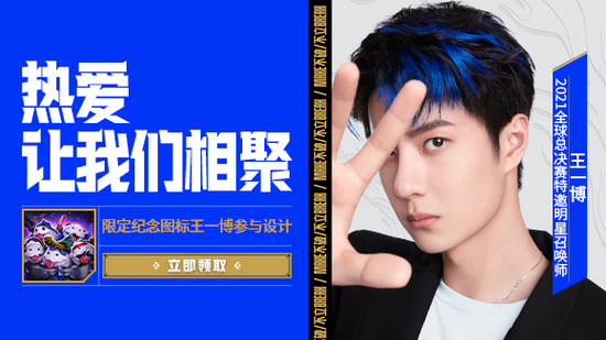 随着歌曲的发布,在《英雄联盟》中也同时上线了“热爱让我们相聚"纪念图标领取活动,而作为S11特邀明星召唤师,王一博也参与了这款限定纪念图标的设计。