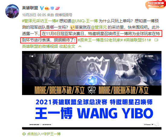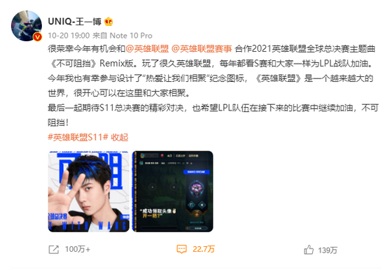 英雄联盟S赛是全球影响力最大的电竞赛事之一,此次携手王一博这样的新生代顶流明星,二者的合作也为S11增加了许多看点。