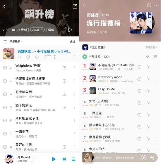 2021英雄联盟全球总决赛主题曲《不可阻挡》王一博Remix一经发布,就迅速获得了粉丝和玩家的重点关注,短短2小时内,就登陆了QQ音乐新歌榜第5名,在微博上与之相关的话题也频频登陆热搜,可谓人气火爆。