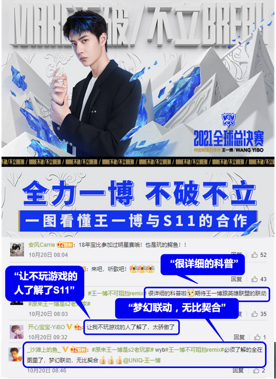 值得一提的是,新歌发布后,以往对S赛事不太了解的明星粉丝也纷纷开始关注英雄联盟S11的信息,通过粉丝间的相互“科普”对英雄联盟及英雄联盟赛事有了进一步的了解,并对此次“梦幻联动”表示认可。