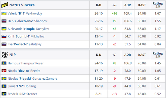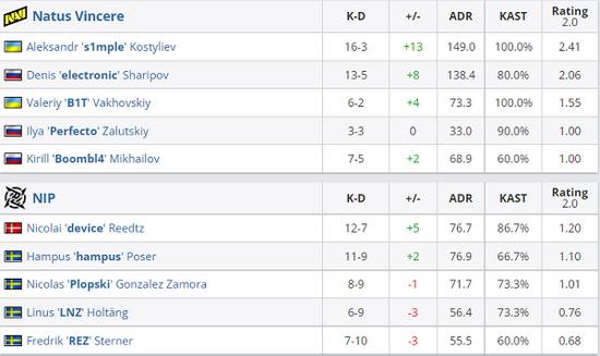 下半场hampus三杀为队伍首开局面,赢下手枪局的NIP趁势而上连追三分,NaVi在重新起回长枪后电子哥混烟打掉B区防守人员,NaVi占下B区仅剩的阿汤哥也只能被迫保枪,次局NIP强起完成翻盘,但NaVi很快便用一波行云流水的进攻给予回应,关键局NIP选择强钢但s1mple一人便将NIP的防守撕碎,经济崩盘的NIP只能眼睁睁的看着NaVi拿到赛点,赛点局手握枪械优势的NaVi没有给到NIP任何机会,随着大B哥手刃Rez,NaVi也是以16-9赢下比赛胜利。