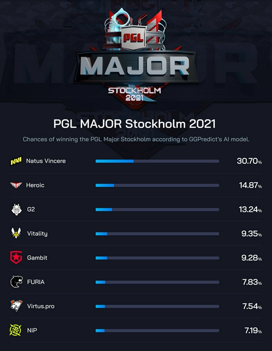 近日,海外机构用AI智能系统模拟并预测了PGL斯德哥尔摩Major淘汰赛阶段的赛事,结果显示NaVi的夺冠几率最大。