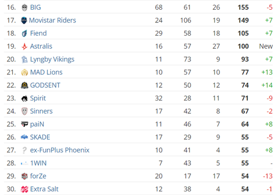 在本期排名中,一些队伍的排名因阵容变化而下降,并且该现象可能会呈现扩大化。其中,Astralis买来了blameF和konfig,是其中最显著的变动。其他像forZe和、Spirit和Complexity皆处于重建边缘。