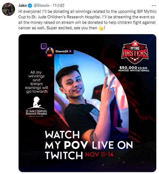 “大家好,我最近会参加IBP Mythic Cup的比赛,同时我也决定将我在这个比赛中的所有奖金以及期间直播收入全部捐赠给St. Jude儿童研究医院,希望能够帮助到儿童对抗癌症的治疗。我已经迫不及待的想要比赛啦,到时候见。”