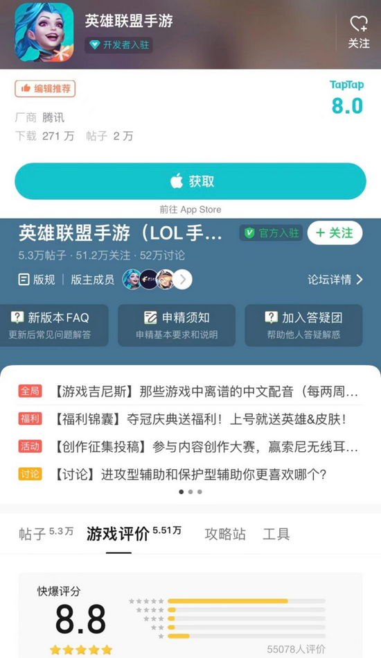 这样一款游戏内外都倍有诚意的游戏也得到了玩家们的支持。自从10月份上线以来,英雄联盟手游在AppStore连续登顶免费榜(游戏)41天,可谓热度爆棚,与此同时,英雄联盟手游的口碑也非常坚挺,在TAPTAP上总计有10万人为英雄联盟手游评分,截至目前评分8.0;在好游上,英雄联盟手游也有5.5万人进行了评论,截至目前评分8.8。对于一款用户基数极大的游戏来说,这样的分数可以说是口碑超好了!