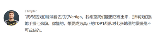 NAVI当家狙击手s1mple在近期接受了门户网站pley.gg的采访,他在采访中表示,希望队伍能够把现役7张竞技地图通通练出来,超越自我,进一步巩固NAVI世界第一的地位。