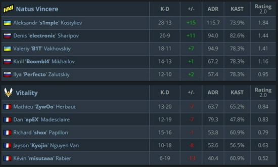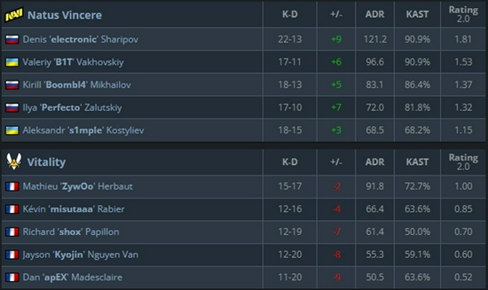 尽管ZywOo展现出了不俗的实力,但无奈electronic和s1mple今日更胜一筹,以1.61和1.50的恐怖Rating率众全面出击,加上NAVI在控图和道具细节处理上的恰到好处,使得NAVI轻松赢下了本应焦灼的大战,随着全队的无解发挥,NAVI成功晋级决赛。