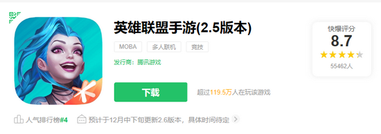 在11月初拳头游戏官方公布的数据中显示,英雄联盟宇宙系列产品全球月活跃账户已经突破1.8亿,可以推测,《英雄联盟手游》等新品的上线为其带来了巨大增量。