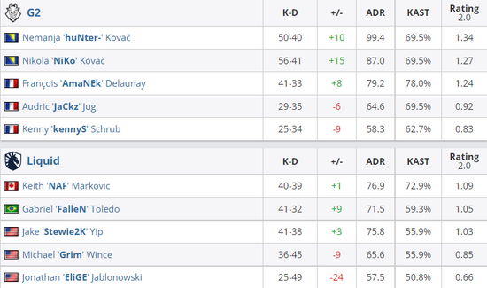 下半场后NAF和Stewie2K精准定位不断为队伍创造优势,但AmaNEk的高质量对枪和补防速度劝退了Liquid,G2连续追分,AmaNEk又完成4杀1v2残局,G2拿到赛点。心态崩溃的Liquid无心恋战落入败者组。