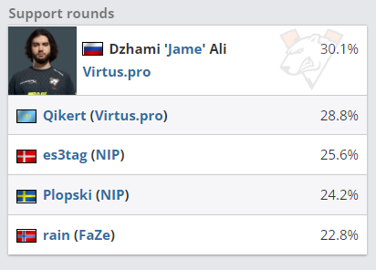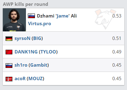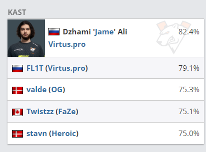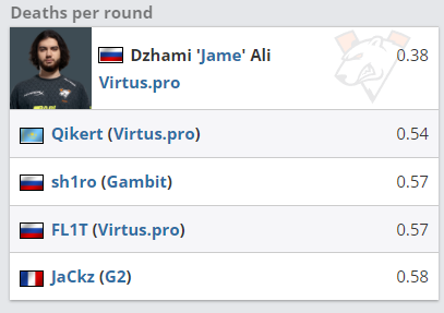 Jame在本次比赛中发挥神勇,率领VP一路击溃ENCE、Gambit与GODSENT,以全胜之姿直通淘汰赛半决赛。截止目前,他在死亡数、有效支援率、KAST、大狙击杀数等方面均名列前茅。