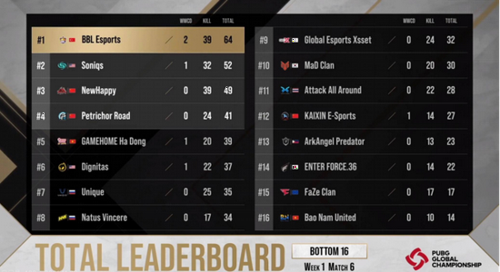 上周未晋级周决赛的16支战队将通过后16位排位赛,来决定本周周中赛的出场顺序。在6场排位赛中,BBL战队发挥神勇,吃下两鸡,以64分获得了首个补位名额。上周发挥欠佳的SQ战队在第五局收获一鸡,升至第二名。PCL的两支种子战队NH和PeRo也展现出较好的状态,分别位列第三和第四。KX战队凭借最后一局的吃鸡升至第十二位。
