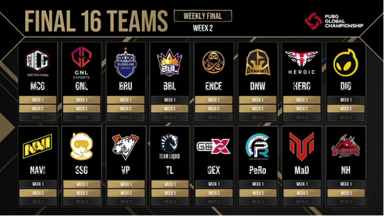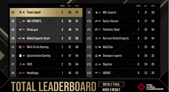 【Krafton Inc.旗下PUBG工作室】信者永恒,竞绽光芒!Krafton Inc. 旗下PUBG工作室举办的PGC 2021(PUBG GLOBAL CHAMPIONSHIP 2021,简称“PGC 2021”)全球总决赛第二周的比赛已经落幕。TL战队凭借两天稳健的发挥,收获50个淘汰,并以81分摘得了本周的周冠军。GNL战队同样收获了50个淘汰与81分,但以吃鸡数的劣势屈居第二。欧洲冠军VP战队一转上周的颓势,以74分位居第三。来自中国台湾的GEX战队本周手感火热,拿下68分排名第四,并收获了全场最高的52个淘汰。PCL赛区的三支队伍MCG、NH和PeRo战队均有吃鸡入账,分别位列第五、第八和第十一名。