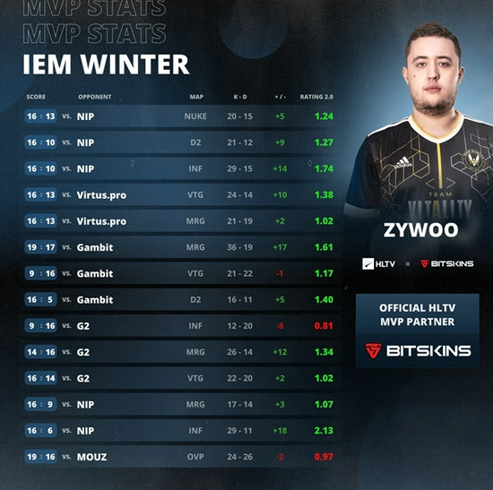 来自法国的ZywOo在本届赛事收获了自己职业生涯中的第12个MVP奖章。