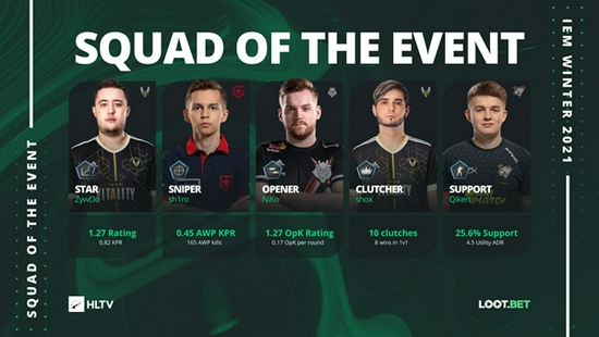 MVP ZywOo根据HLTV历年来评选TOP选手的规则,今年的TOP1已经毫无悬念的属于s1mple,而TOP2的争夺则空前激烈。除了ZywOo,还有sh1ro,NiKo等选手虎视眈眈。此前争议最大的是sh1ro和ZywOo谁才是TOP2,在获得IEM冬季赛冠军之前,ZywOo无论是在团队荣誉上和个人荣誉上都没有办法和独联体狙击手相比,但是在有了IEM的冠军和MVP的buff之后,再加上还未公布的几个赛事EVP,可以说在个人数据上更占优势和线下比赛发挥更为出色的的ZywOo几乎已经站稳了TOP2的位置。