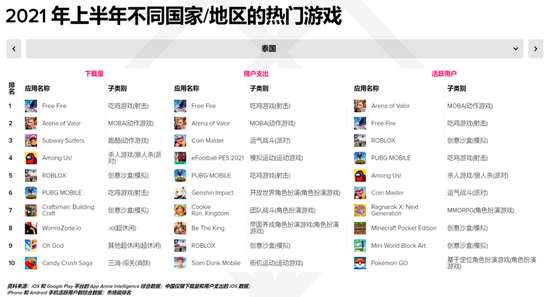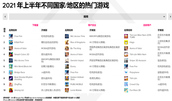 但凡事也有个例外。王者荣耀国际版(下简称AoV)出海五年,不仅没有失去自身新鲜感,甚至愈加的火爆。根据App Annie数据显示,AoV在2021年上半年成功拿下泰国下载&支出第二、月活第一,2021上半年越南月活&下载第三、支出第四的成绩。