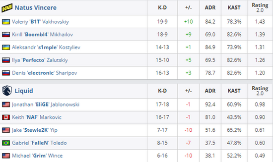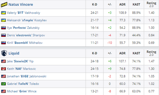 下半场手枪局Liquid三人配道具,但前压的CT被EliGE架死,B区前压亦是如此。人数劣势让NaVi丢下了至关重要的一分。次轮赌错方向让NaVi再失一分。当长枪局到来时,比赛已然来到了14-4。长枪局electronic击杀EliGE,但大坑与墓地的乌克兰双雄并没有造成人数击杀,余下三人只得保枪,15-4 Liquid先拿赛点。巨大优势的Liquid选择直接Rush B区,最终倒在了NaVi的道具控制下。次轮s1mpleA点四杀再拿一分。但比分差距过大让NaVi也无能为力,最终Liquid强攻A区击杀electronic与s1mple,剩余二人面对2打4残局且对方占据有利枪位也无力回防。Liquid 16-7击败NaVi拿下BLAST全球总决赛开门红。