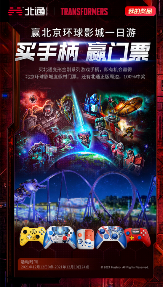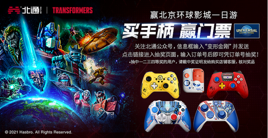 凡在2021年12月20日0点前在任意电商平台购买北通变形金刚系列手柄任意一款或多款的用户,即可凭订单号在北通微信公众号参与抽奖活动,不仅能得到北通变形金刚正版马克杯和北通限量周边等奖品,更有机会赢得北京环球影城门票!