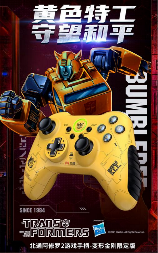 作为擎天柱的忠实伙伴,大黄蜂紧随其后,化身为北通人气明星手柄——北通阿修罗2变形金刚限定版。手柄主体全部采用黄色设计,配以棱角分明的黑色线条,大黄蜂经典元素百分百复刻还原。