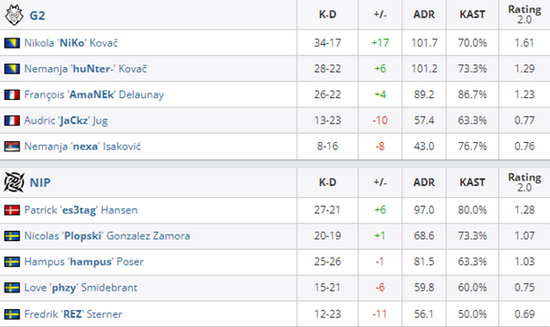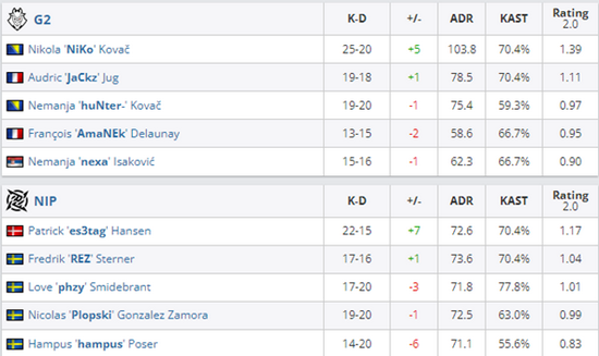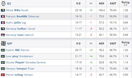 来到下半场手枪局,新人小将phzy与REZ携手击杀铁板四人,G2计划直接破产输下手枪局。Eco与半起皆未能创造奇迹,长枪局G2虽然除波黑兄弟外皆倒下,但波黑兄弟的残局能力也是有目共睹的,双人五杀拿下下半场第一分,hampus未起拆弹器十秒强拆从而错失机会。次轮再次内场进攻拿下人数优势,但雷包掉在了黄门,关键时刻phzy连空两枪失去了守包机会,成功将NiP打入Eco。但长枪局G2仍想故技重施,NiKo外场快速进入正门配合队友占领A包点,但3打4的回防被NiP成功拿下,随后又依靠不断地前压将人数拉开,NiP先拿赛点。尽管G2顽强连胜三合将比分追至大分,但最终Plopski黄房上一波串烧四杀结束了比赛,NiP16-11先胜一局。