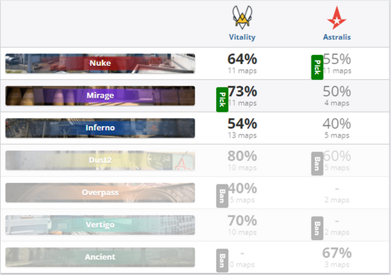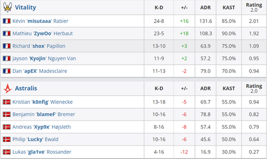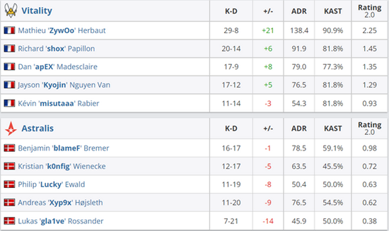 Vitality 2-0 Astralis(Nuke 16-4;Mirage 16-6)