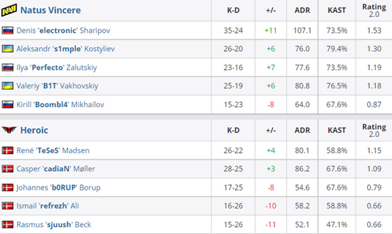 手枪局NAVI围点打援,枪法更是出奇的准收下手枪局。次局电子哥和胖球外场五杀。长枪局boRUP收掉外场电子哥,藏匿的cadiaN也有人头进账,Perfecto和B1T的吹风机击杀m4攻破B点,s1mple上演教科书残局,秒杀拆包的CT赢下胜利。半起的Heroic包点设防配合K1断下NAVI三把枪。第五局NAVI一线烟后下K1,cadiaN大狙阻断了进攻节奏,B1T出奇的准,极致秒杀连斩三员,NAVI ON FIRE。